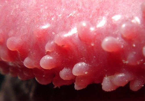 Soi da: Trong quá trình soi da, chuỗi hạt ngọc dương vật sắp xếp theo mô hình giống như quả nho hoặc đá cuội, màu trắng hoặc hồng với các mạch tương tự dấu phẩy. Trong khi đó, mụn cóc sinh_dục thường có biểu hiện bong vảy – đặc điểm không tìm thấy ở hạt ngọc.