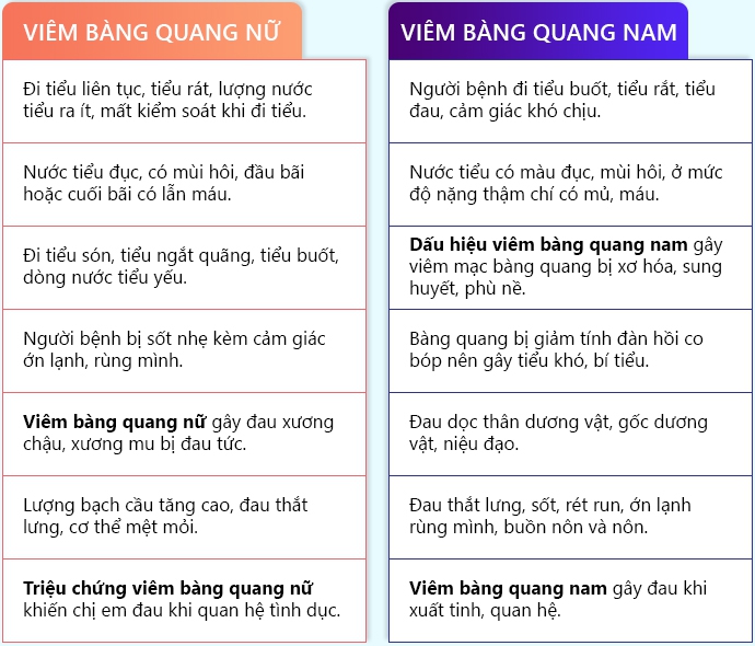 Vì cấu tạo cơ quan sinh dục của nam, nữ khác nhau nên các dấu khi khi bàng quang bị viêm cũng không giống nhau hoàn toàn. Người bệnh có thể nhận biết qua các dấu hiệu như sau: